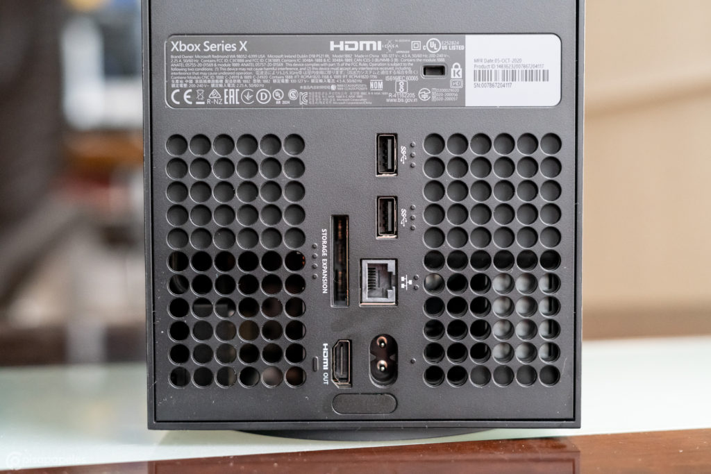 Por la parte frontal nos encontramos con el botón de encendido/apagado (que además se ilumina), el botón de sincronización, y el lector de discos Blu-Ray con el respectivo botón para eyectar el disco. Por atrás nos encontramos con las distintas entradas y puertos: cable de poder, HDMI, ethernet, dos puertos USB y el slot para colocar el SSD oficial de Xbox para aumentar el almacenamiento, junto con unas rejillas para mejorar la circulación de aire.