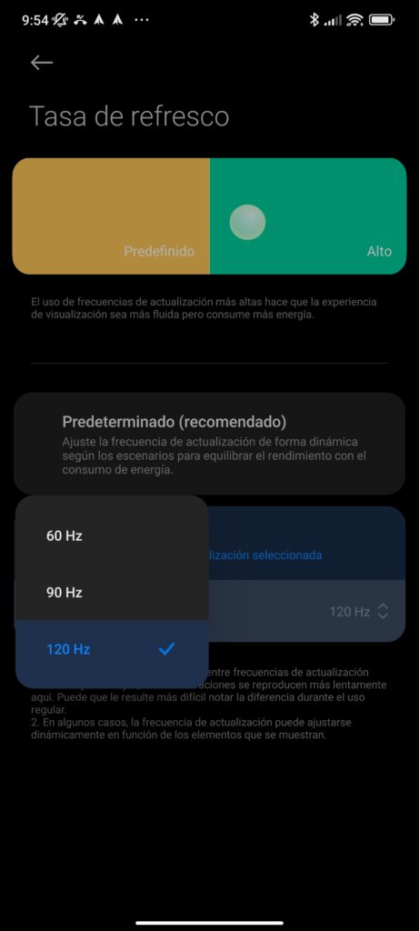 Tenemos una tasa de refresco de 120Hz lo que ayuda a la fluidez de la pantalla para que podamos ver desplazamientos 100% fluidos, sin nada de lag, lo cual obviamente se agradece. Ahora, en el menú de ajustes puedes elegir el modo “Predeterminado” para que la frecuencia de actualización se ajuste automáticamente, pero también puedes elegir para que corra a 60, 90 o 120Hz.