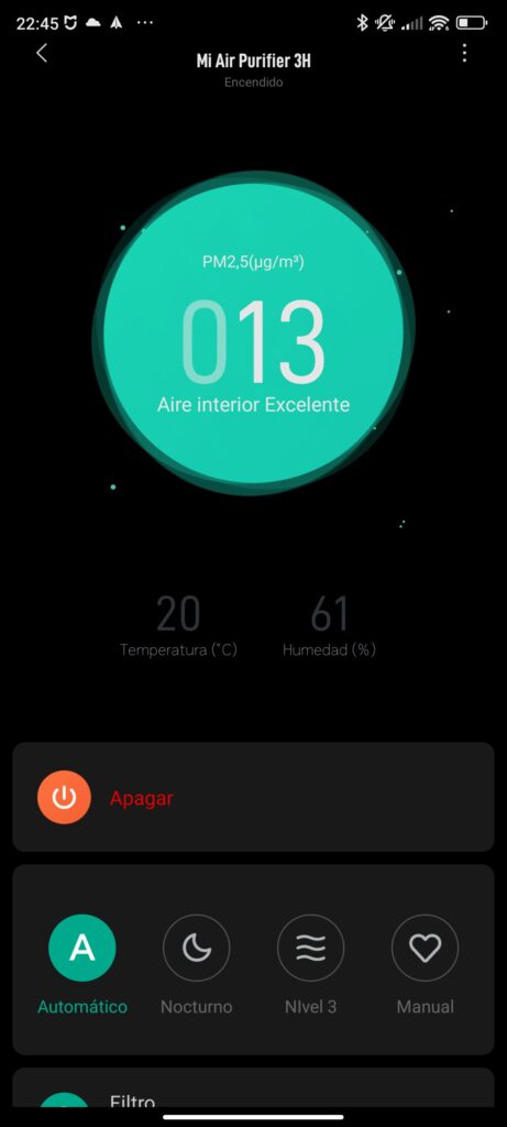 En cuanto a funciones, la verdad es que lo encontré muy completo, aunque debo confesar que es la primera vez que usaba un purificador de aire en la vida. Me gustó que se puede conectar a la app Mi Home y controlarlo remotamente, especialmente porque es compatible con el Asistente de Google, por lo que puedo pedirle que lo encienda y apague con la voz.