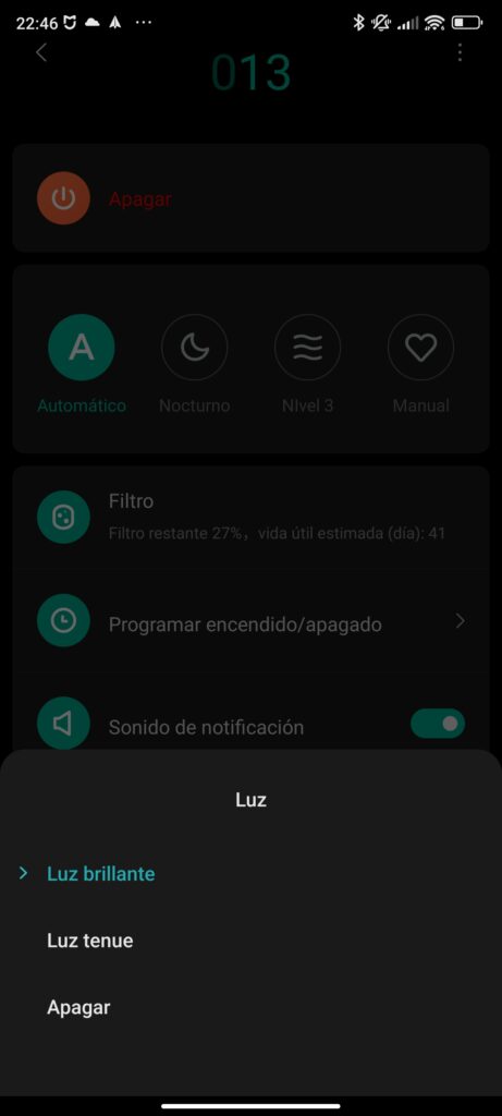 Continuando con la app, hay una opción llamada “Filtro” que nos muestra el porcentaje restante para que cambiemos el filtro por uno nuevo. En mi caso me queda un 27%, lo que equivale una vida útil de 41 días más. Estos filtros suelen durar 8 meses aproximadamente (todo depende del uso que le demos), y en tiendas de Xiaomi los encuentras desde los CLP$39.990 aproximadamente.