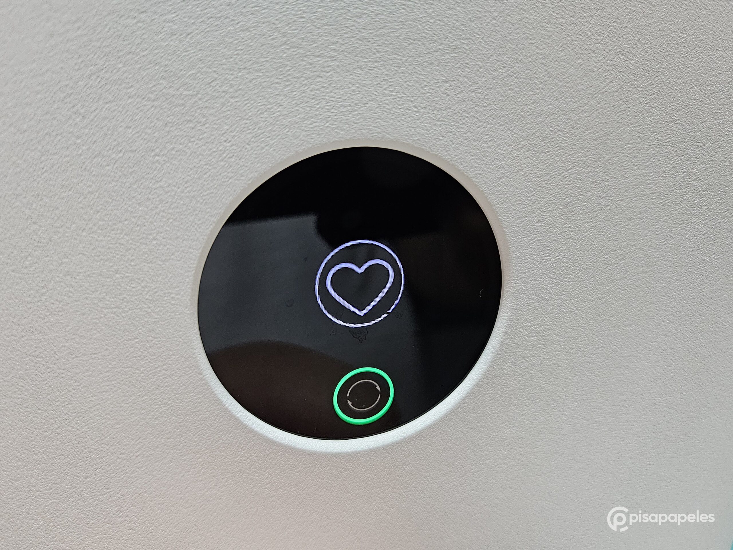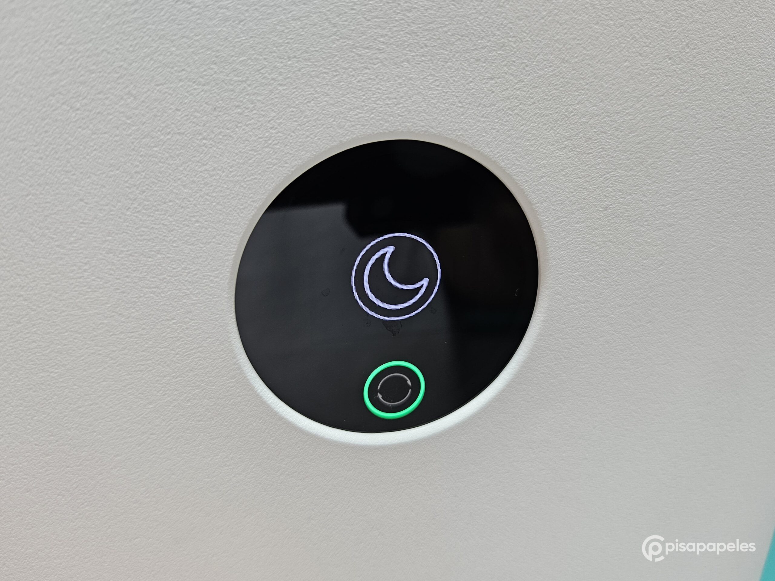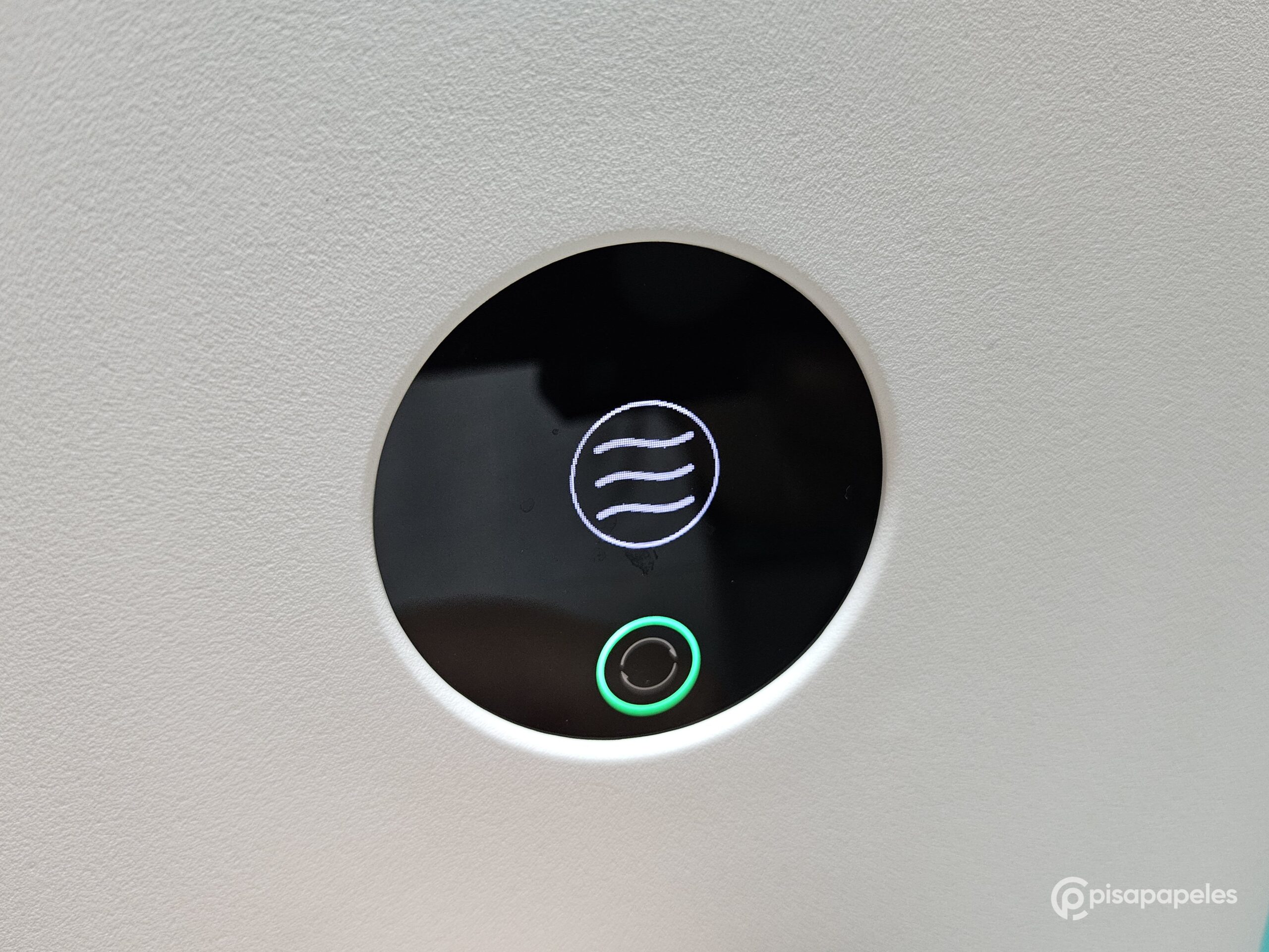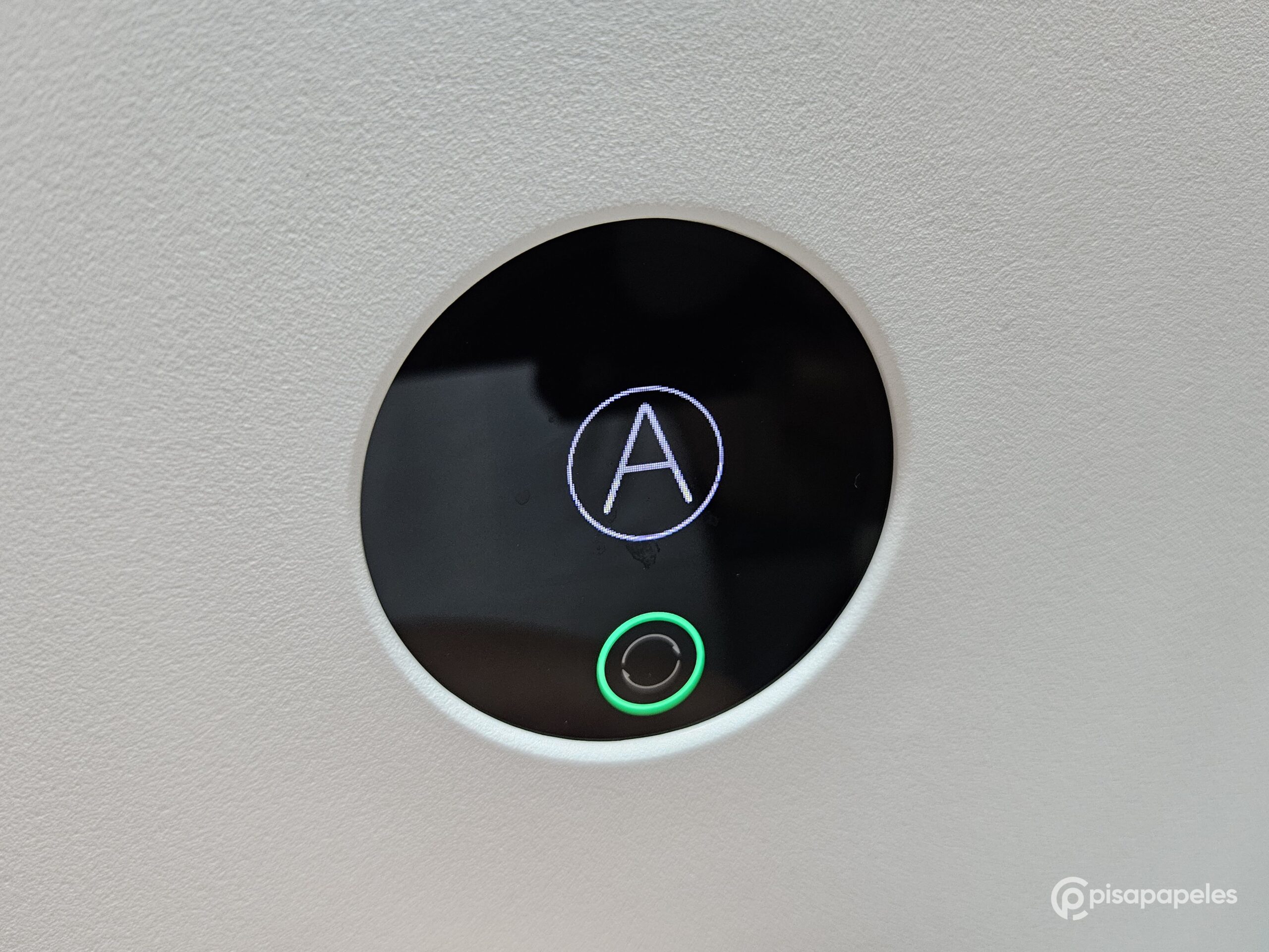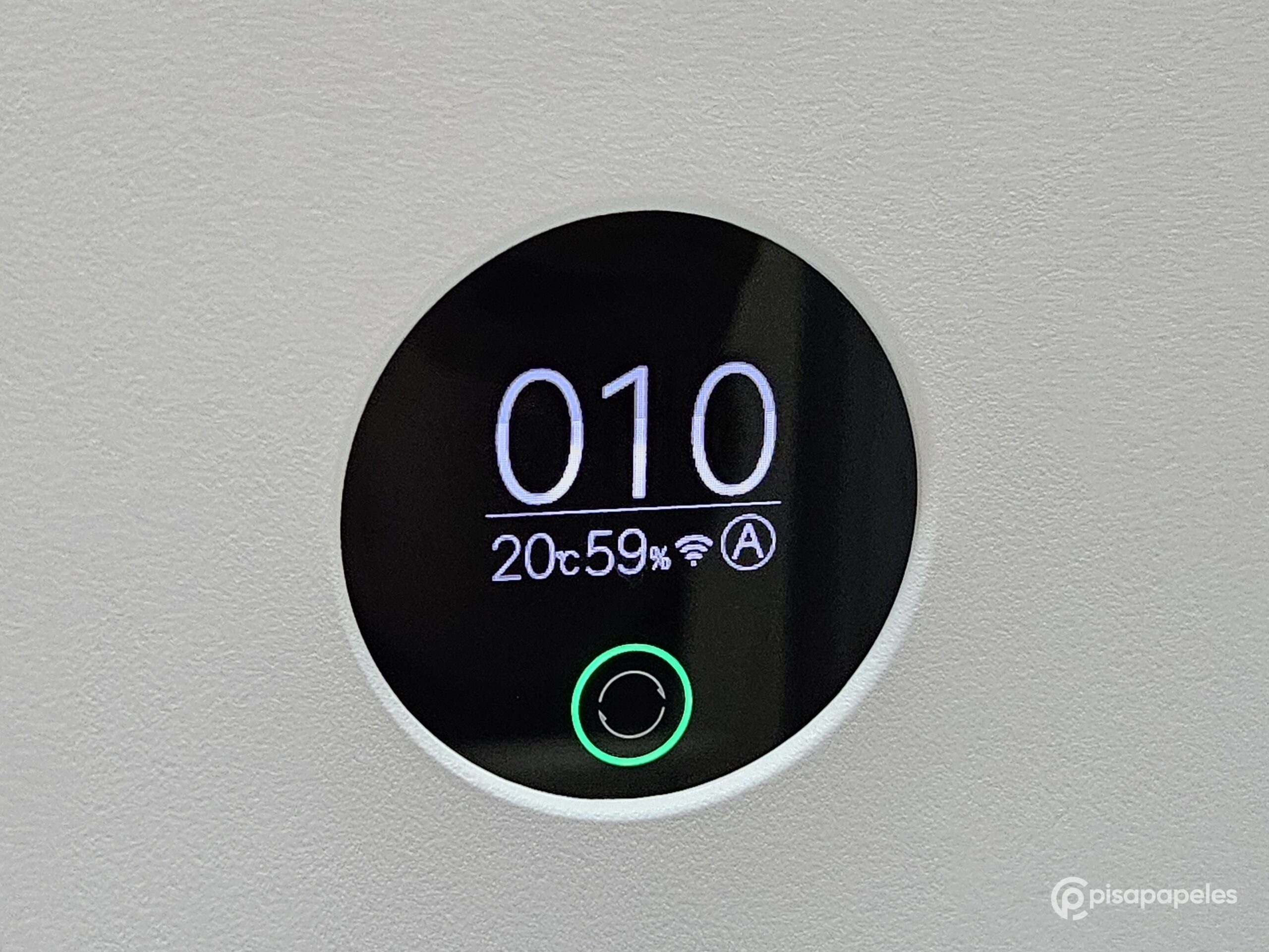 Por el lado frontal encontraremos una pantalla OLED que nos va mostrando el estado del purificador y obviamente la calidad del aire en tiempo real, incluso nos muestra la temperatura del ambiente. Acá también hay un botón táctil que nos permitirá controlar sus funciones o apagar y encender el dispositivo.