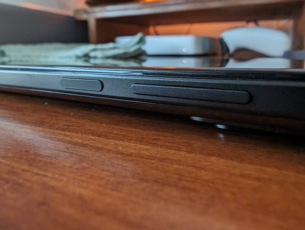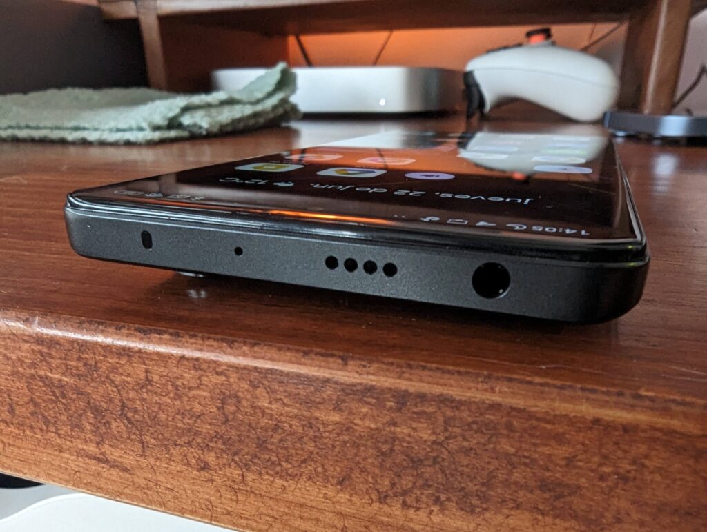 Los bordes del teléfono están hechos de plástico, y en este marco podemos encontrar los botones de volumen, el botón de encendido, que también alberga el sensor de huellas, un conector de audífonos de 3.5mm y el puerto USB-C. Los botones tienen un buen tacto al presionarlos, pero el botón de encendido no tiene ninguna diferencia táctil con los botones de volumen, lo que puede llevar a presionarlo por error o confundirlo con los botones de volumen.