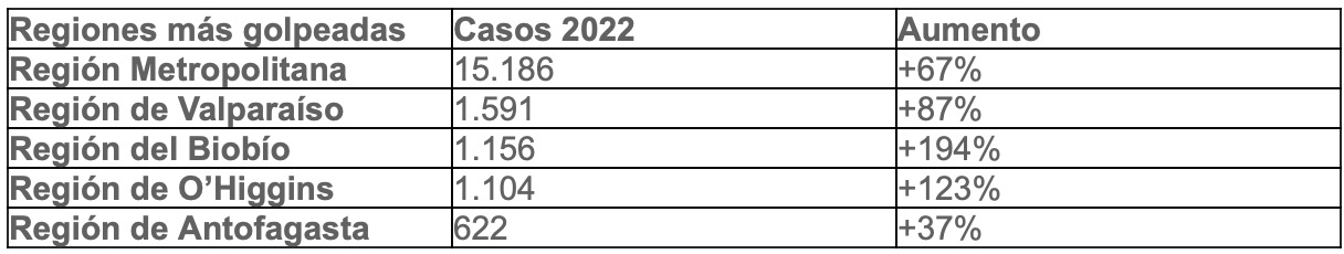 Según cifras de Movistar, la Región Metropolitana, Valparaíso, Biobío, O’Higgins y Antofagasta son las regiones que mayor cantidad de robos de cables sufrieron durante el 2022. Además, todas ellas aumentaron en porcentaje en cantidad de hechos ocurridos en el 2021, especialmente la de O’Higgins y Biobío.