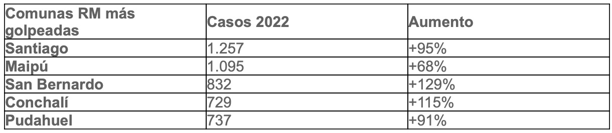 En cuanto a las comunas de la Región Metropolitana, la más afectada fue Santiago, seguido por Maipú, San Bernardo, Conchalí y Pudahuel.