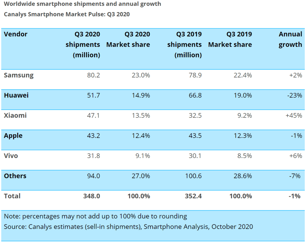 Huawei le sigue con el segundo lugar con un 14.9% del mercado y 51.7 millones de unidades enviadas, y si comparamos con el tercer trimestre del año 2019, podemos ver que en ese entonces tenía un 19%, por lo que queda claro que sus ventas están bajando lamentablemente.