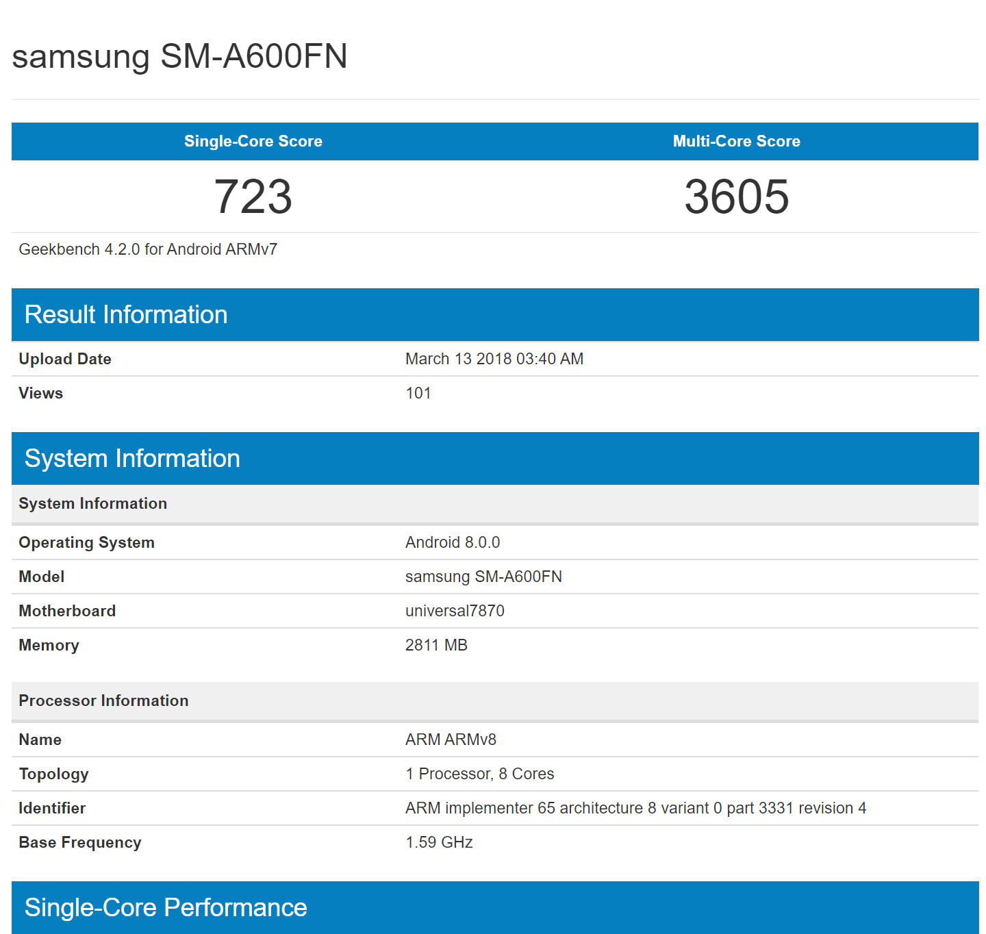 Si eres de los más curiosos en el mundo benchmark, déjame comentarte que el Galaxy A6 logró 723 puntos en la prueba Single-Core y 3.065 en la Multi-Core.