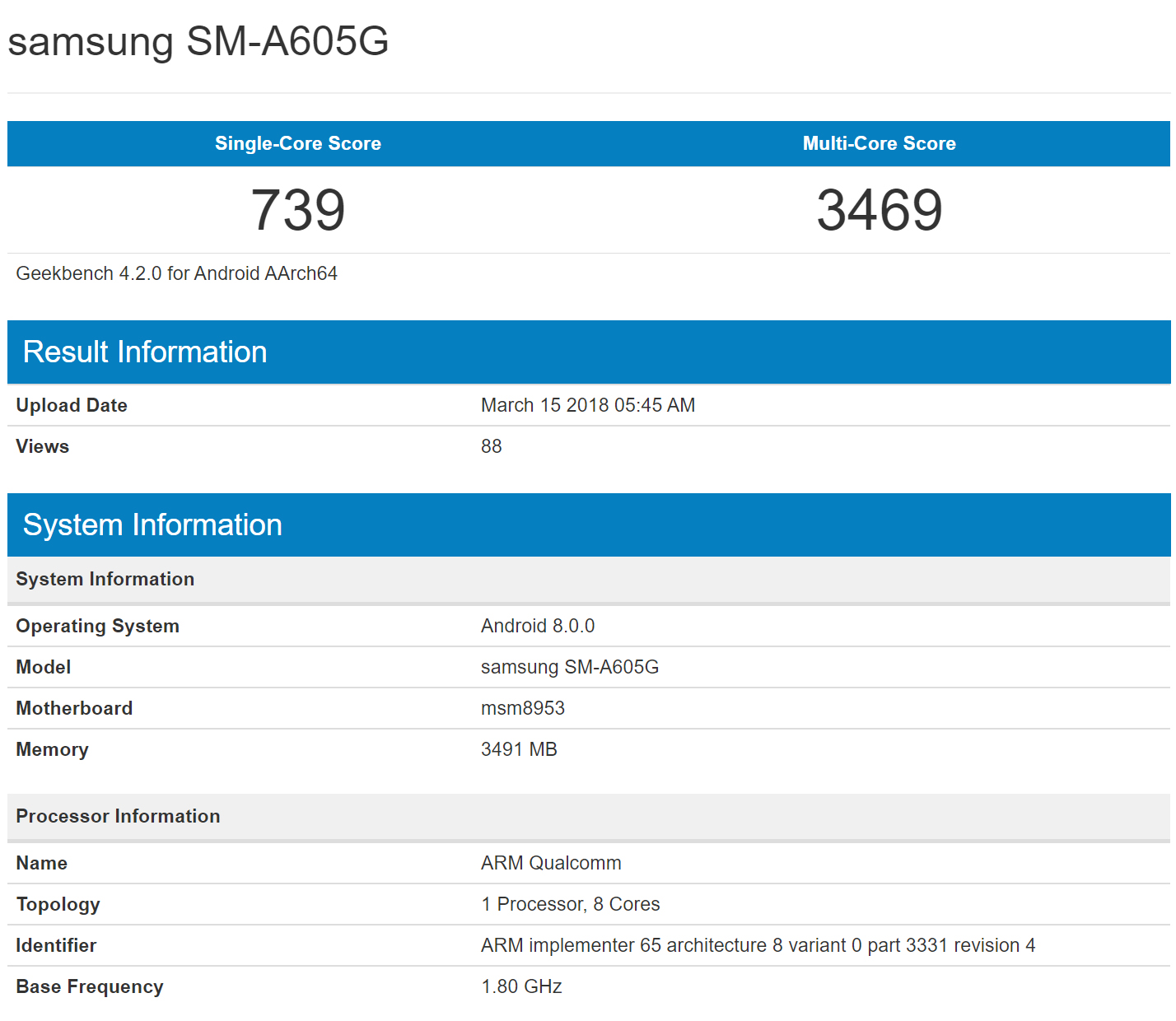 La variante Plus de los aparatos filtrados el día de hoy se conoce también como SM-A605G. Aquí su procesador no sería de fabricación propia de Samsung, sino que más bien se optará por un Qualcomm Snapdragon 625, o al menos eso dicen las especulaciones. O sea, en el test figura que la velocidad de frecuencia del chipset es de 1,8GHz; aunque lo extraño radica en que el Snapdragon 625 en realidad se estira hasta los 2,0GHz. A lo mejor recortaron la potencia de manera intencional, quién sabe.
