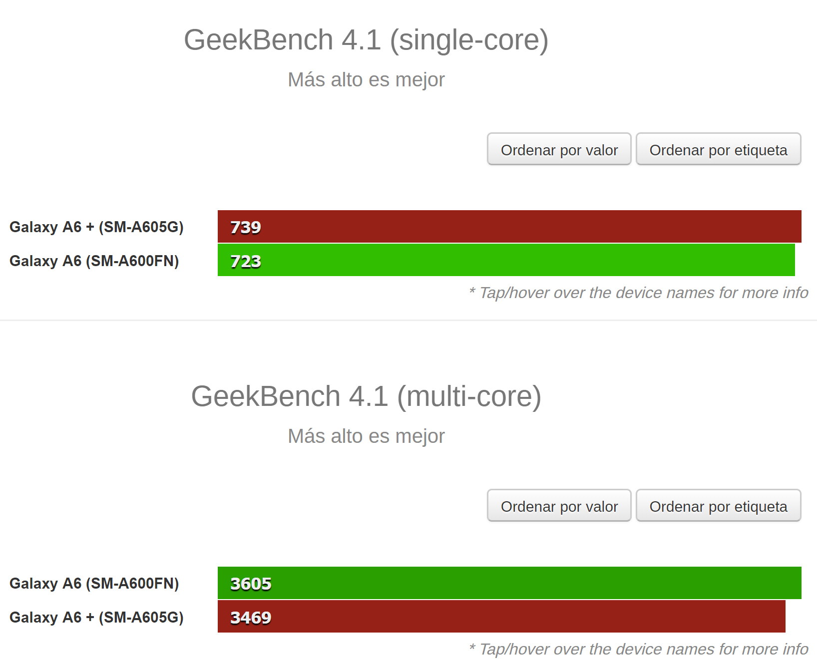 El Galaxy A6+ logró 739 tantos en Single-Core y 3.469 puntos en Multi-Core.