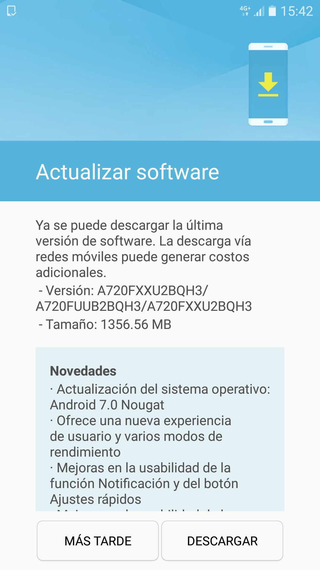 Como pudiste leer en la captura de pantalla enviado por uno de nuestros lectores, la actualización trae consigo a Android 7.0 Nougat que es la versión más reciente del sistema operativo móvil de Google, además de ofrecer una experiencia gráfica renovada, muy similar a la que vemos en la actualidad en los Galaxy S7.