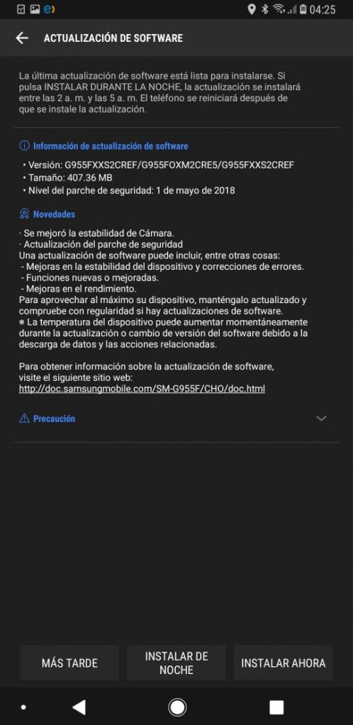 Esta actualización ha comenzado a llegar a las variantes SM-G950F y SM-G955F que corresponde a su versión Libre en Chile y que son comercializado por Samsung en sus tiendas y el retail. Esta actualización tiene un peso de 408MB aproximadamente.