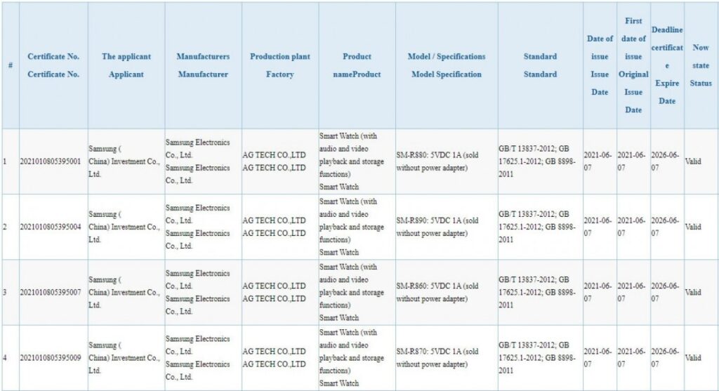 Según la fuente, está la variante SM-R860 que corresponde al Galaxy Watch Active4 de 39 mm, luego tenemos a la variante SM-R870 que es el Galaxy Watch Active4 de 43 mm, sigue la variante SM-R880 que es el Galaxy Watch4 de 41 mm y finalmente tenemos la variante SM-R890 que es el Galaxy Watch4 de 45 mm.