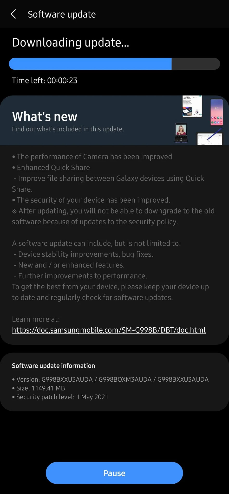 La actualización supera los 1,2GB, ya que no solo trae el parche de mayo, también trae mejoras para la cámara de la línea Galaxy S21, así como también mejoras para la aplicación Quick Share. Así que será mejor que tengas una conexión Wi-Fi disponible cuando recibas la actualización.