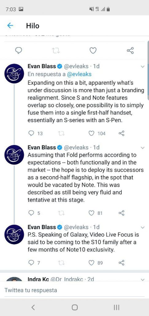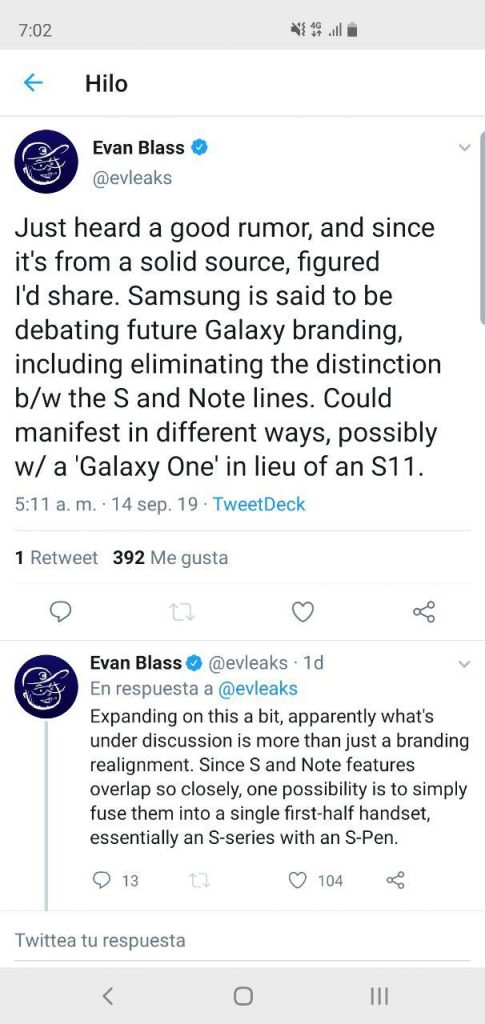 Al parecer todo esto que les estoy contando está un paso más cerca de ser realidad, tal como comenta el famoso filtrador Evan Blass en su cuenta de Twitter. De ser cierto, es muy probable que el próximo año veamos algo como un Galaxy S11, S11 Pro y una tercera variante que podría llevar un S-Pen con todas las funciones ya conocidas del Galaxy Note.