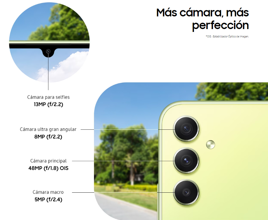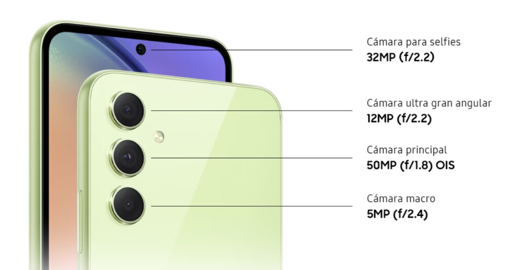 La triple cámara posterior modifica su disposición. Aquí tenemos una lente principal de 50MP apertura f/1.8, AF y OIS. Le complementan un sensor ultra gran angular de 12MP con apertura f/2.2 y un macro de 5MP con apertura f/2.4. La cámara frontal se decanta por 32MP con apertura f/2.2. El Galaxy A54 incorpora estabilización digital de imagen de vídeo (VDIS) mejorada. Y lleva un optimizado modo Noche (Night mode). En este sentido, comparte esas «características plus» (OIS en cámara principal, VDIS y modo Noche) con el Galaxy A34.