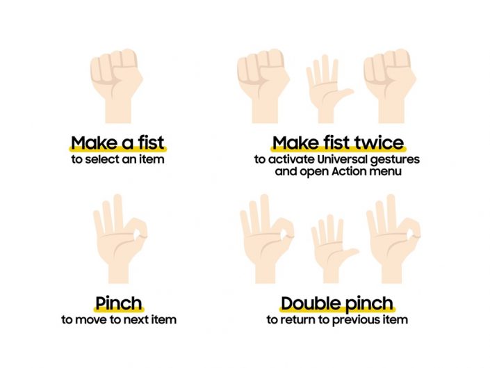 Gestos Universales ofrece a los usuarios una alternativa sin contacto para interactuar con tu Galaxy Watch, utilizando gestos como cerrar el puño, pellizcar y más. Estos gestos permiten a los usuarios seleccionar elementos, abrir menús y navegar por su dispositivo de una manera más intuitiva y personalizada.
