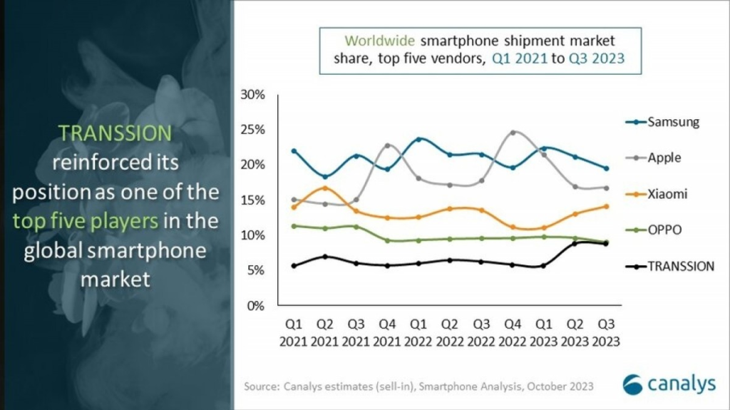 Más abajo aparece Transsion (9%), propietaria de las marcas itel, Infinix y Tecno. Este conglomerado ya está muy cerca de superar a Oppo en envíos mundiales. La sorpresa del año sin dudas es Huawei, quienes han regresado con fuerza en los últimos tres meses con el lanzamiento de la serie Mate 60.