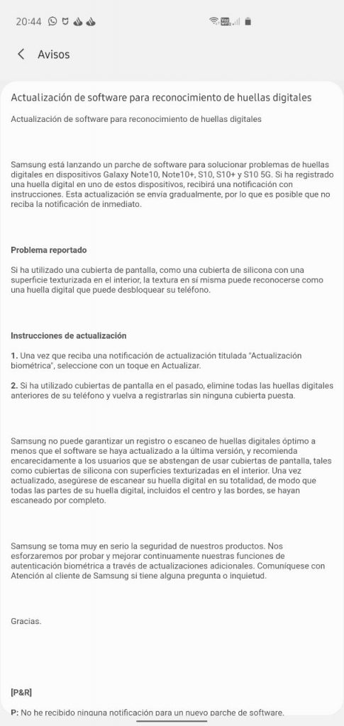 Dicha actualización llega directamente al firmware del lector de huellas ultrasónico, para que así no se tenga la necesidad de enviar una actualización de software completa a todos los equipos afectados. Al actualizar, Samsung recomienda volver a registrar sus huellas para una mayor seguridad.