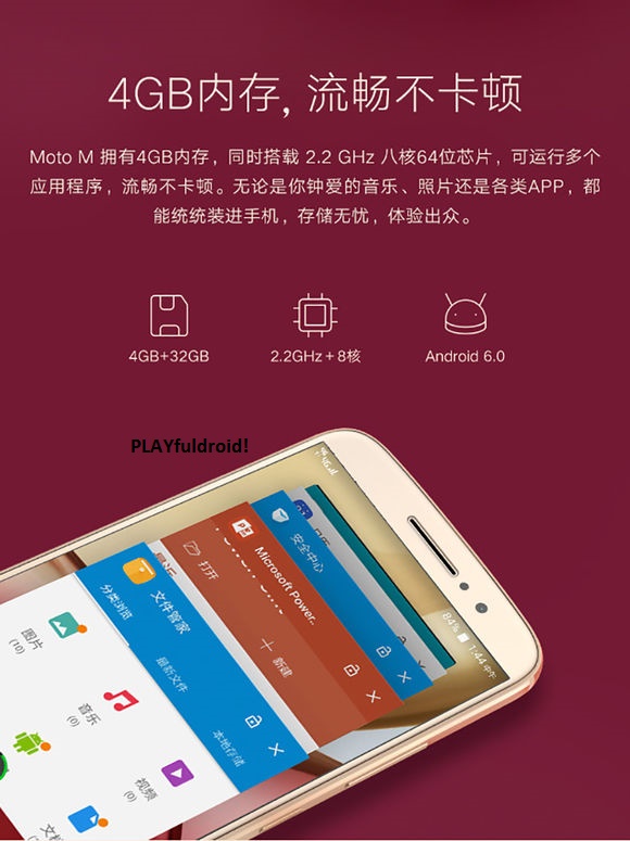 El Moto M estará movido por un SoC MediaTek P10 octacore corriendo a 2.2 GHz, 4 GB de RAM, 32 GB de memoria interna ampliable, batería de 3050 mAh con carga rápida, cámara de 16MP con enfoque láser, cámara frontal de 8MP con gran angular, pantalla de 5.5 pulgadas Full HD, estará movido por Android Marshmallow (asumimos que actualizará a Nougat), y tendrá audio Dolby Atmos.