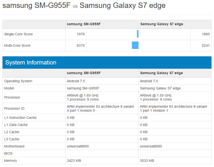Según Geekbench el Exynos 8895 ha arrojado una puntuación de 1978 con un núcleo y de 6375 en multi núcleo mientras que el Snapdragon 835, ha dado 1929 y 6084. Puntaje que deja al esperado Snapdragon 835 unos puntos más abajo.
