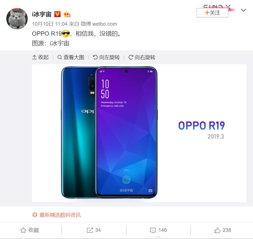 En la parte inferior de la parte frontal se que el lector de huellas estaría ubicado tras la pantalla, mientras que en la parte trasera del dispositivo se puede observar que contaría con una cámara doble con orientación vertical. En el mismo render se especifica que la fecha de lanzamiento del Oppo R19, estaría planificada para marzo de 2019.