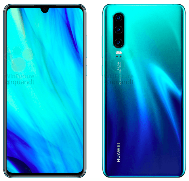 Las imágenes vienen gracias al sitio WinFuture que ha publicado estos renders oficiales del Huawei P30 y P30 Pro. A simple vista podemos ver que por la parte frontal el modelo Pro prácticamente no tiene bordes, mientras que el P30 «a secas» tiene unos bordes más notorios. Esto último quizás tiene relación con el tipo de pantalla que tendrán estos equipos, una OLED (P30 Pro) y una IPS LCD (P30) como sucede con los iPhone XS y iPhone XR.