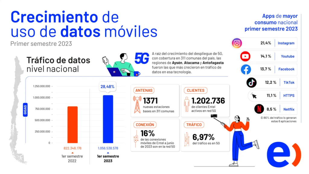 El uso de datos 5G a nivel nacional aumentó siete veces más en el primer semestre de 2023 en comparación con el mismo período de 2022, gracias al despliegue expandido de esta red en todo el país. Las mayores tasas de aumento se registraron en las regiones de Aysén (905 veces), Atacama (93 veces) y Antofagasta (78 veces).