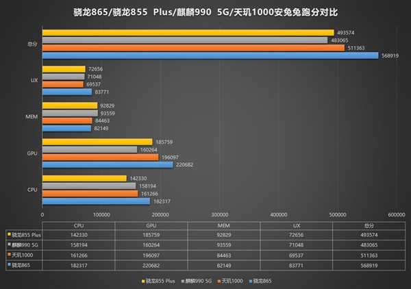 En números generales, el HiSilicon Kirin 990 5G de Huawei llegó a los 483.065 puntos, el Snapdragon 855 Plus (el antecesor al puntero de ahora) obtuvo 493.574 tantos y el MediaTek Dimensity 1000 trepó hasta los 511.363.