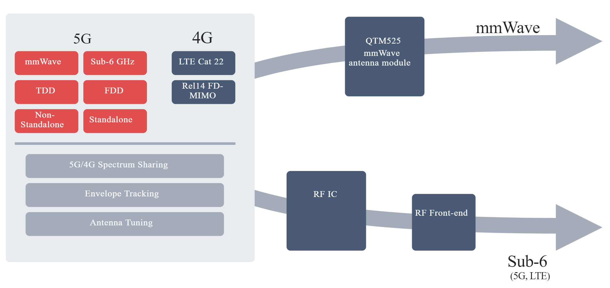 El módem Snapdragon X55 5G es compatible con prácticamente cualquier combinación de bandas de espectro y/o modos: 5G mmWave y sub-6 GHz, modos independiente y no independiente, TDD y FDD, uso compartido de espectro, LTE y modos heredados (2G, 3G).