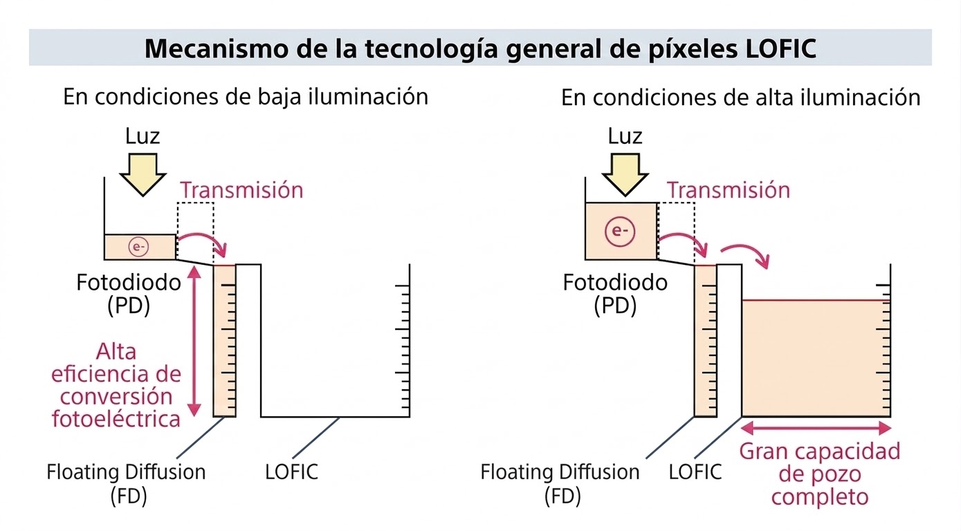 El esquema anterior detalla cómo la arquitectura LOFIC trabaja de forma distinta según la iluminación de la escena. En baja luz prioriza eficiencia fotoeléctrica, mientras que en alta iluminación suma una gran capacidad de carga para contener mejor las zonas brillantes.