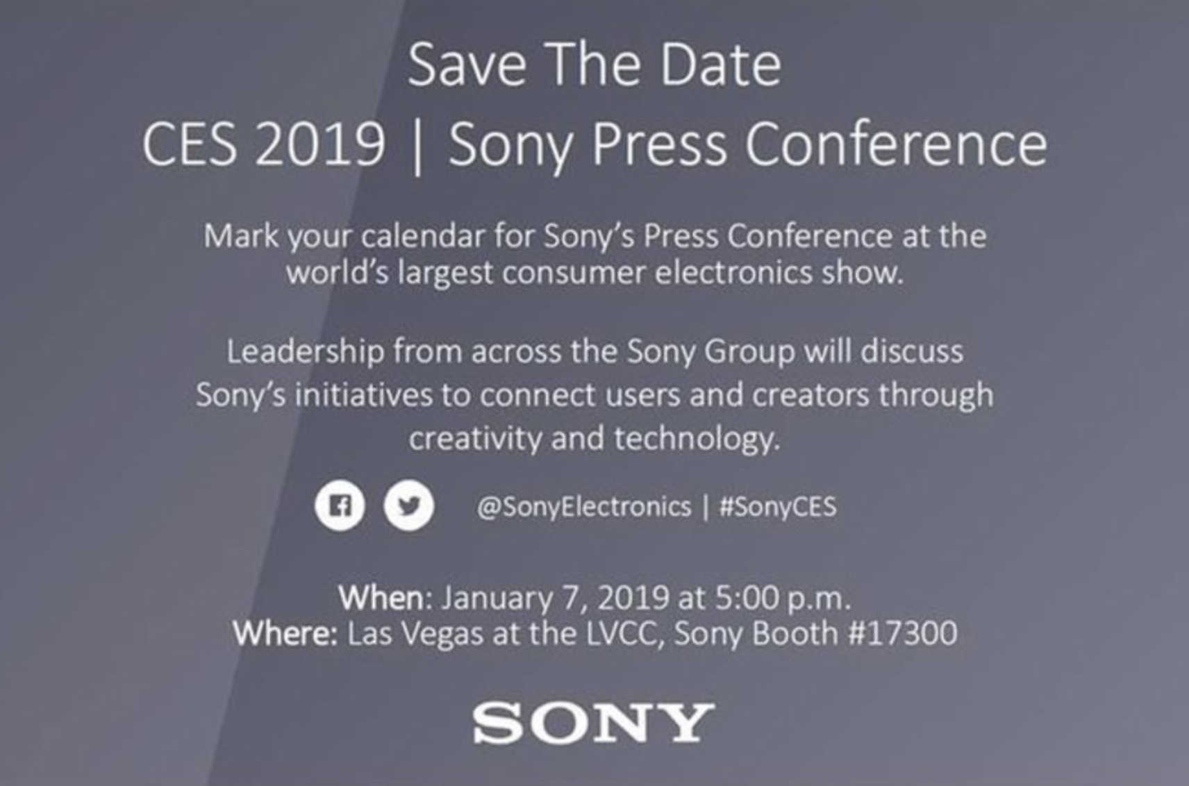 Estamos a menos de una semana del comienzo oficial del CES 2019 y Sony ya nos tiene una cita pactada para allí. La firma está distribuyendo invitaciones de prensa para un evento suyo a desarrollarse en el marco de la feria de electrónica de consumo más grande del planeta.