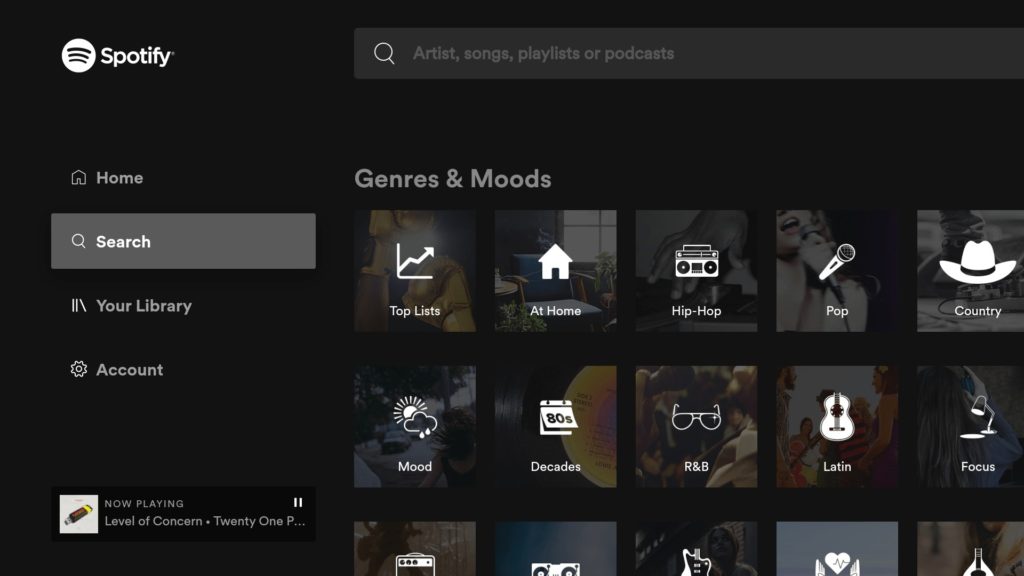 La pestaña Inicio contiene álbumes o listas de reproducción reproducidos recientemente y, debajo, hay secciones para incluir la mezcla diaria del usuario, las estaciones de radio recomendadas y otras formas de contenido recomendado. La pestaña Buscar también incluye las opciones «Géneros y estados de ánimo» que no estaban disponibles anteriormente en la aplicación de Spotify para Android TV.