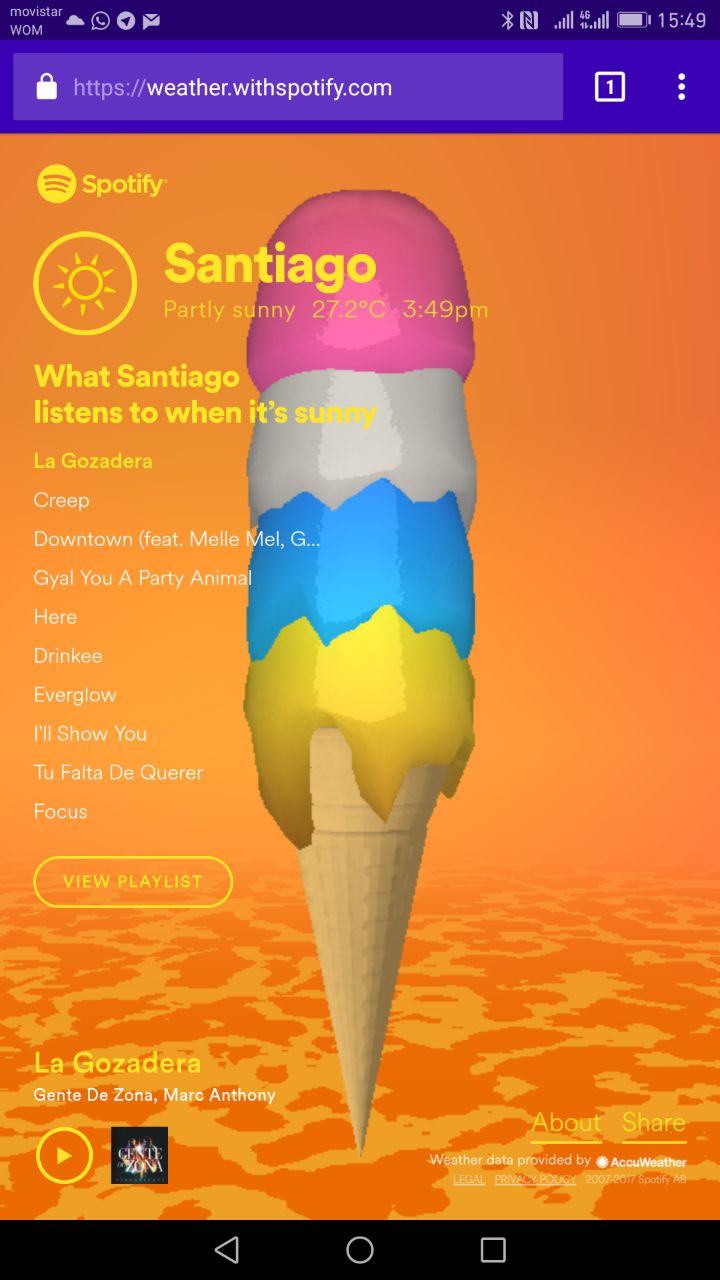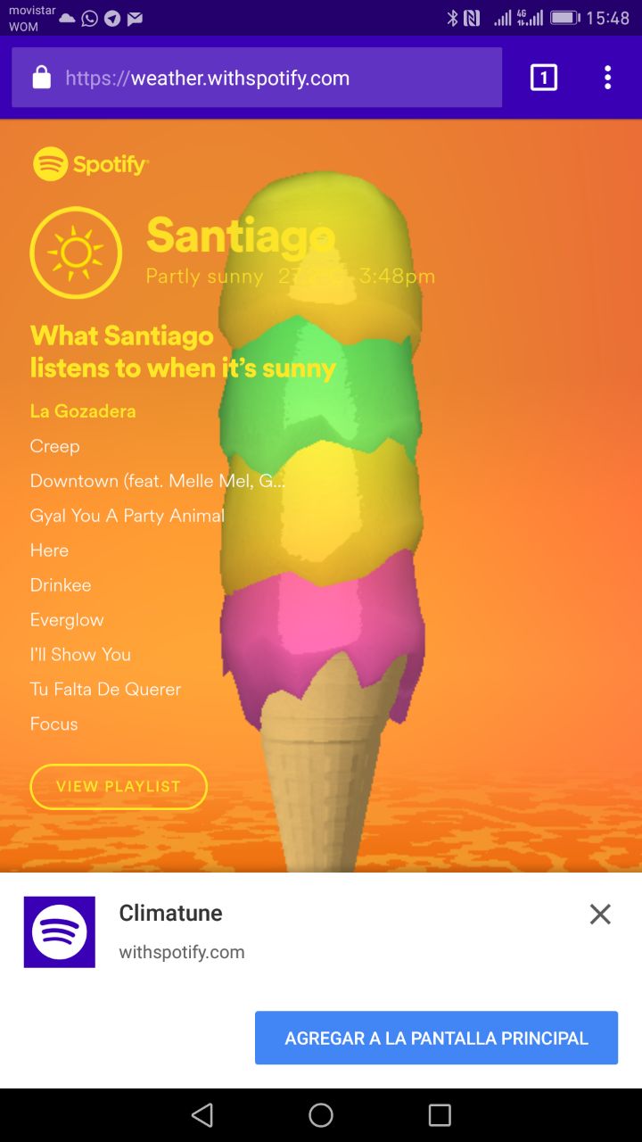Para acceder a Climatune solo ingresa a weather.withspotify.com desde el navegador web de tu smartphone, inicias sesión con tu cuenta de Spotify y la página detectará tu ubicación y el clima actual, para luego ofrecerte los playlist correspondientes.