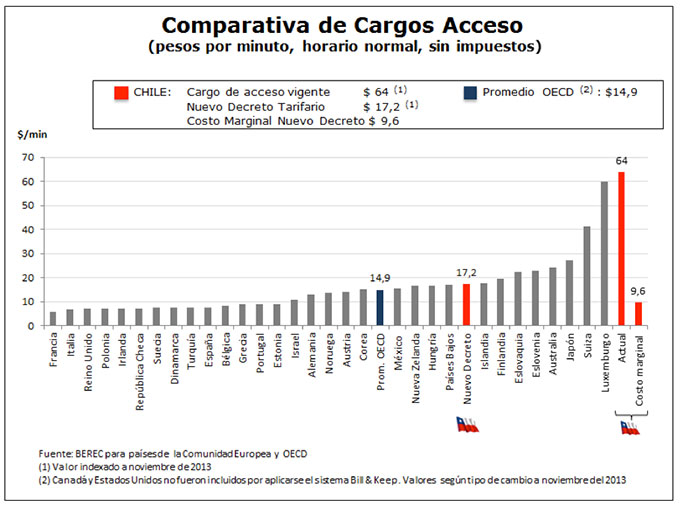 En acuerdo alcanzado con la Contraloría General de la República, la Subtel anunció que los cargos por minuto en la telefonía móvil caerán hasta un 75% en el periodo 2014-2019. Este nivel de precios pasó a reemplazar al establecido previamente en diciembre de 2013.