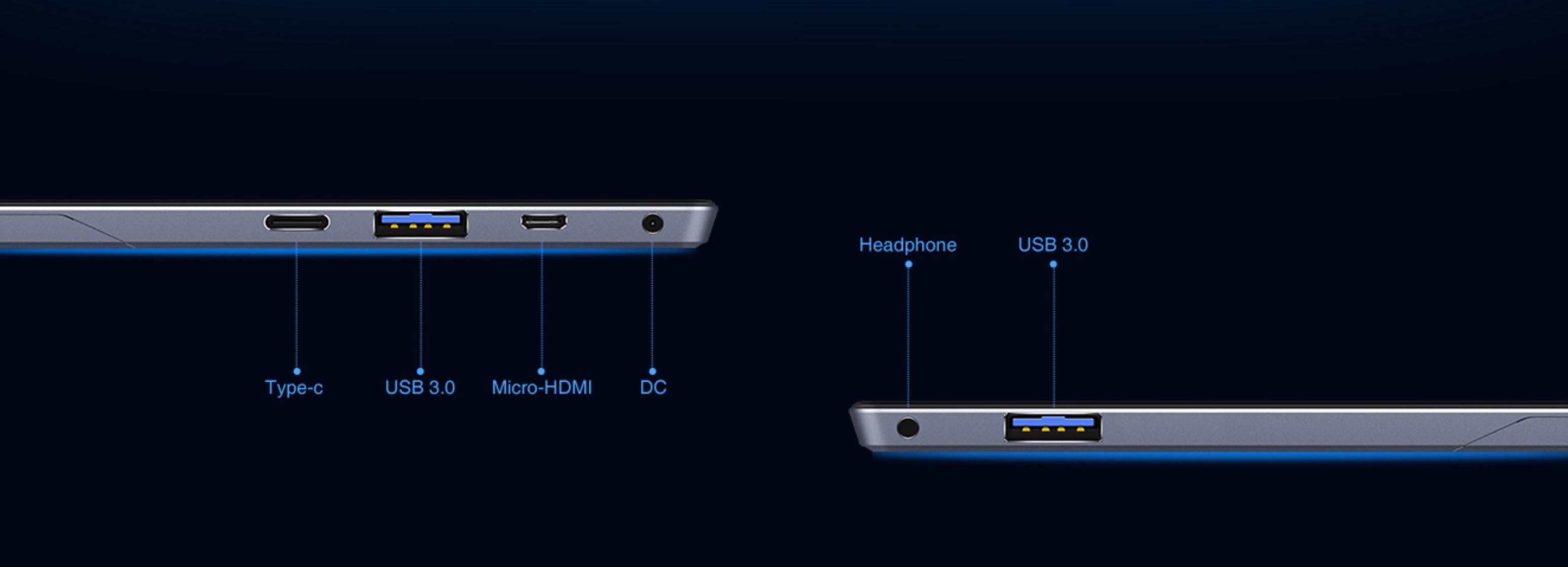 Dispone de dos puertos USB-A 3.0, un USB tipo C, uno DC, un conector Micro-HDMI y un conector para auriculares.