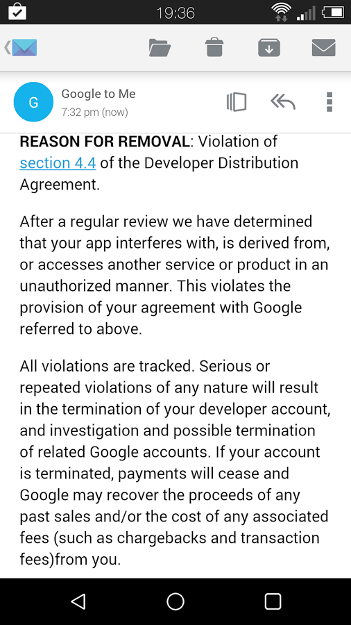 Pero Google ha reprobado dicha situación, ya que ellos indican que la aplicación viola los derechos de autor (ya que la aplicación es de propiedad de Google) y además la sección 4.4 acuerdo de distribución de los desarrolladores, retirando la aplicación de la Play Store. Acá un extracto del mensaje de advertencia que fue recibido por Shen Ye.