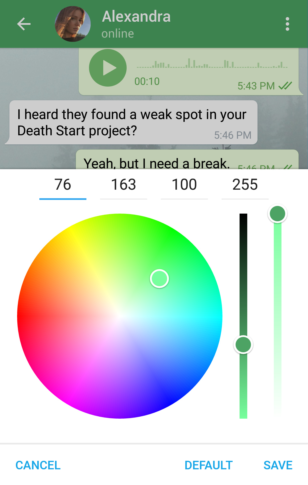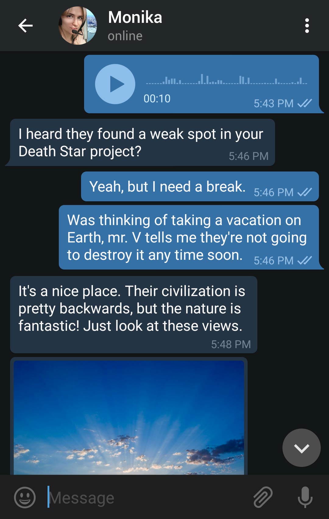 Esta nueva actualización llega con nuevos temas para crear y compartir entre cada uno de los usuarios de Telegram, además de un nuevo modo de visualización llamado «Dark», especial para aquellos que prefieren un fondo más oscuro para el contraste ante la luz.