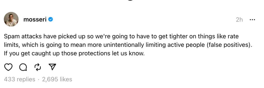 En su publicación, podemos ver que «Los ataques de spam han aumentado, así que vamos a tener que ser más estrictos en cosas como los límites de velocidad [de vista de publicaciones], lo que va a significar más limitación involuntaria de personas activas (falsos positivos). Si te ves atrapado [en] esas protecciones, avísanos».