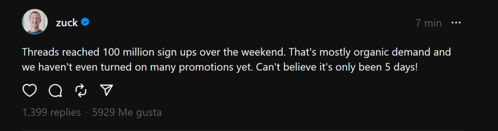 Así, vimos como Threads llegó a los 2 millones de usuarios en dos horas, luego a 5 millones, luego 30 y hasta 70 millones de usuarios hasta este viernes. Pero hoy, su CEO Mark Zuckerberg ha declarado que Threads ha llegado a los 100 millones de usuarios registrados.