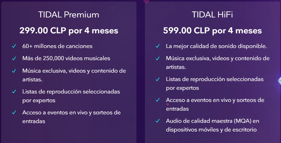 Accede a 4 meses de TIDAL Premium por CLP$300, o accede a TIDAL Hi-Fi (recomendado) durante 4 meses por CLP$600. Pasado dicho periodo, se comenzará a cobrarte la tarifa estándar del servicio. Oferta válida hasta el 2 de diciembre.