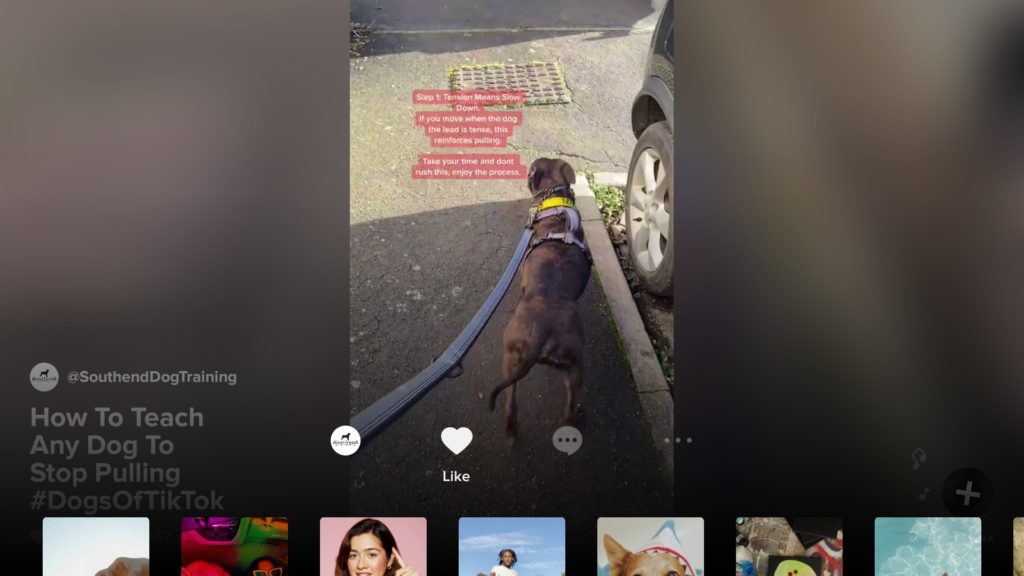 La aplicación para televisores integra las mismas funciones que la aplicación móvil a excepción de la carga de contenido, pudiendo ver los videos de los usuarios que sigues en el inicio, tu perfil y el contenido que has subido. A diferencia de la app para Android, los videos se desplazan de manera horizontal y no vertical.