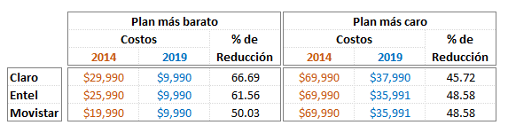 El plan más alto durante el 2014 era por $69.990, con 10 GB de navegación y 1.200 minutos libres. En 2019, el plan más caro es de $37.990, e incluye 70 GB y minutos libres. En esta situación la reducción es de 45.72%