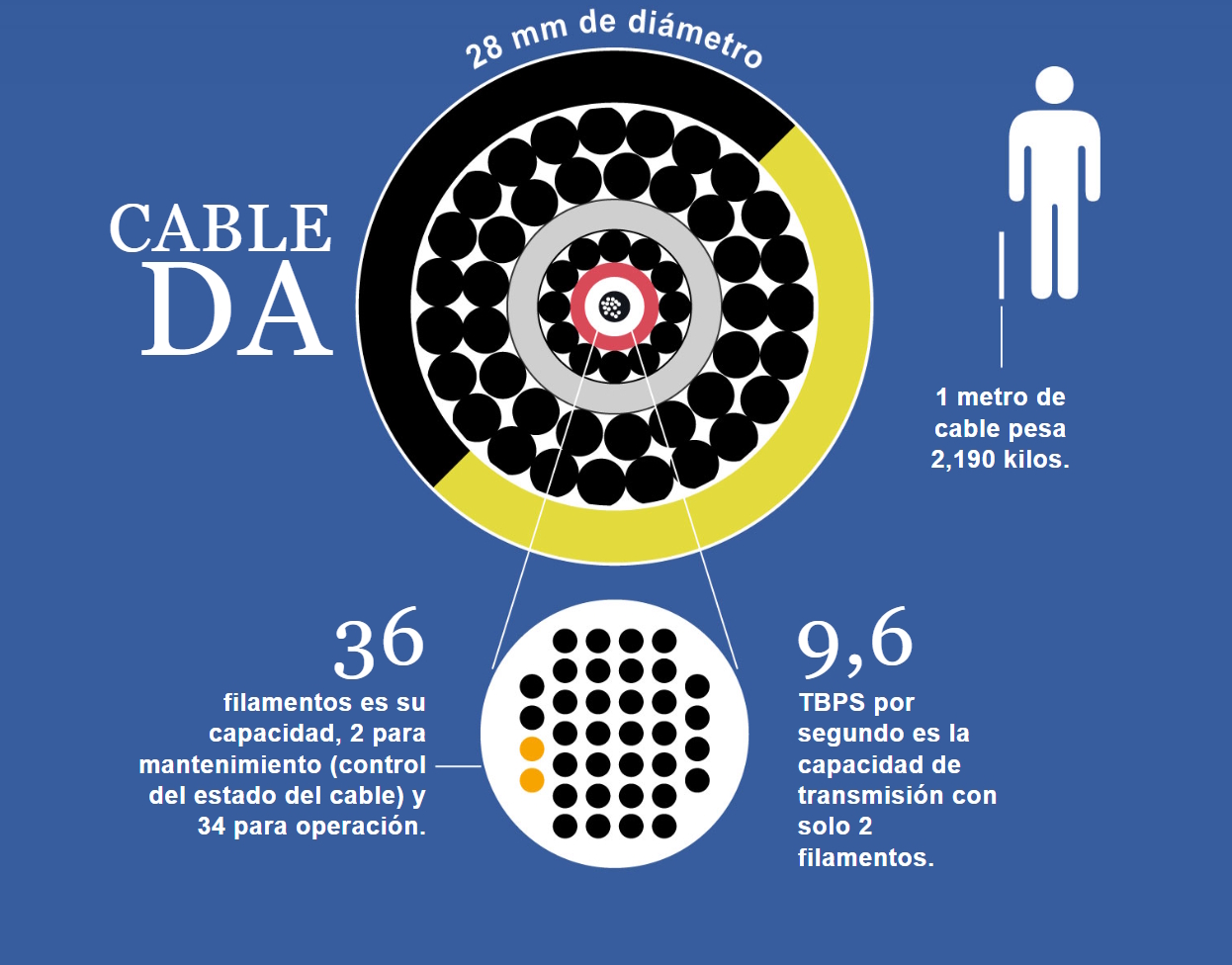 «Esto se complementa con una alta capacidad de transmisión de datos: cuenta con 36 filamentos de fibra óptica; se necesita solo 2 de ellos para transportar hasta 9,6 Tbps».