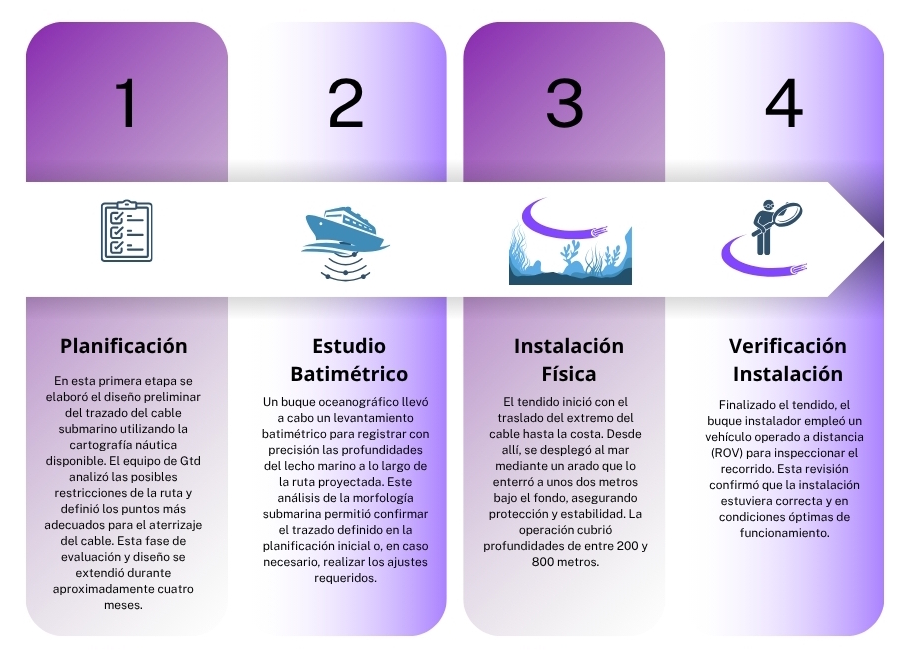 «Este, también, es un cable pasivo no energizado que reduce riesgos operativos, posee una robustez en su construcción, con una doble armadura de acero para resistir impactos externos y fue fabricado en Alemania por una empresa con más de 100 años de experiencia en cables submarinos, con altos estándares de calidad y robustez».