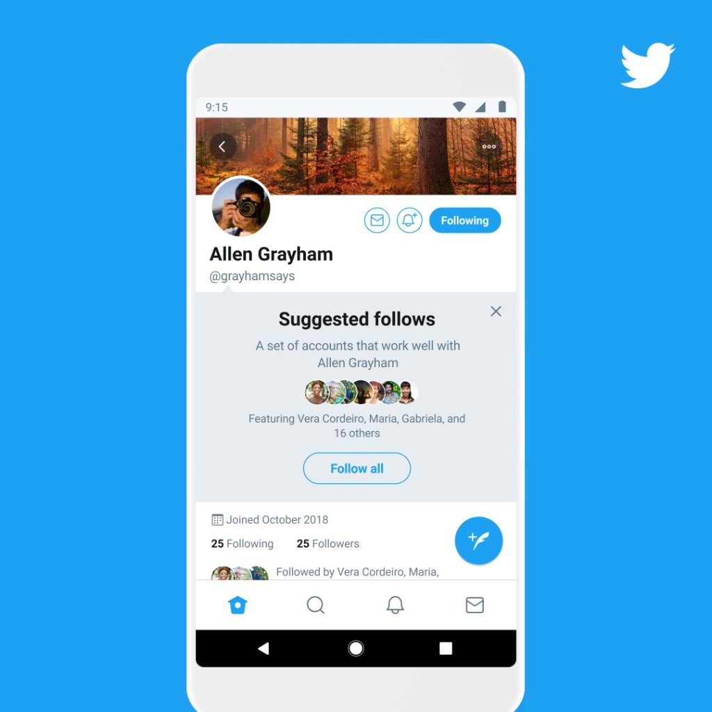 Pues ahora parece ser que Twitter quiere que sigas a más personas, y si es de manera masiva mucho mejor, ya que, un número selecto de usuarios de Twitter para Android tiene disponible una función que permite seguir a un grupo de cuentas de una sola vez.