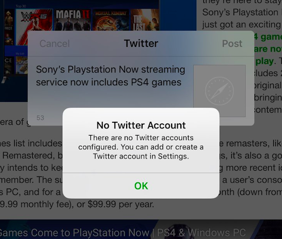 Este error pasaba porque en iOS 10 la función compartir usaba la cuenta de Twitter que ingresábamos en el propio sistema operativo y no la que teníamos en la aplicación oficial, y como en iOS 11 se eliminó esta integración, el sistema indicaba que no había ninguna cuenta inscrita al momento de querer compartir algún dato.