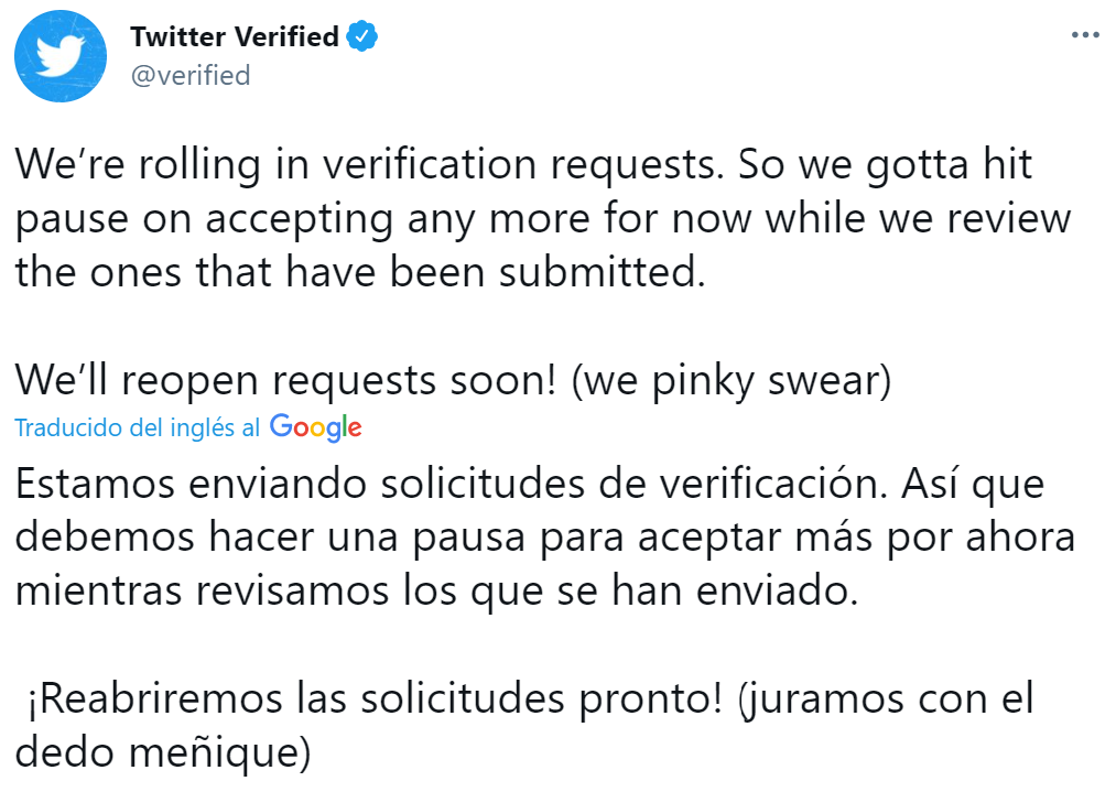 Pero, todo parece indicar que la reactivación de este servicio fue todo un éxito, ya que después de una semana aproximadamente, Twitter ha tenido que salir a comentar que han pausado el proceso de solicitud de verificación de cuentas.