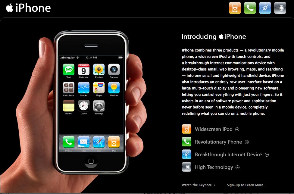 El iPhone fue presentado por Jobs como un dispositivo tres en uno: el que por un lado era un iPod Touch, un dispositivo móvil para realizar llamadas y también era un dispositivo rupturista en cuanto a las comunicaciones por internet. De este anuncio ya ha pasado una década, y al día de hoy ya existen 7 generaciones más de este modelo, que claramente año a año compiten entre ellas con sus nuevas características, diseño y prestaciones. Pero si miramos atrás, esta conferencia marcó un precedente en todos los dispositivos móviles, el iPhone a la fecha de su lanzamiento fue totalmente innovador, fue el primer dispositivo móvil en integrar multi-touch en su pantalla capacitativa de 3.5 pulgadas.