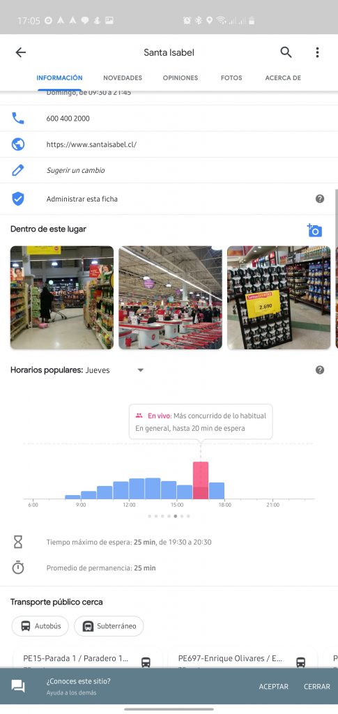 Pues resulta que a esa función le podemos sacar más provecho para poder averiguar si un supermercado se encuentra con mucha gente en su interior o no, y en algunos casos nos entrega información en vivo.