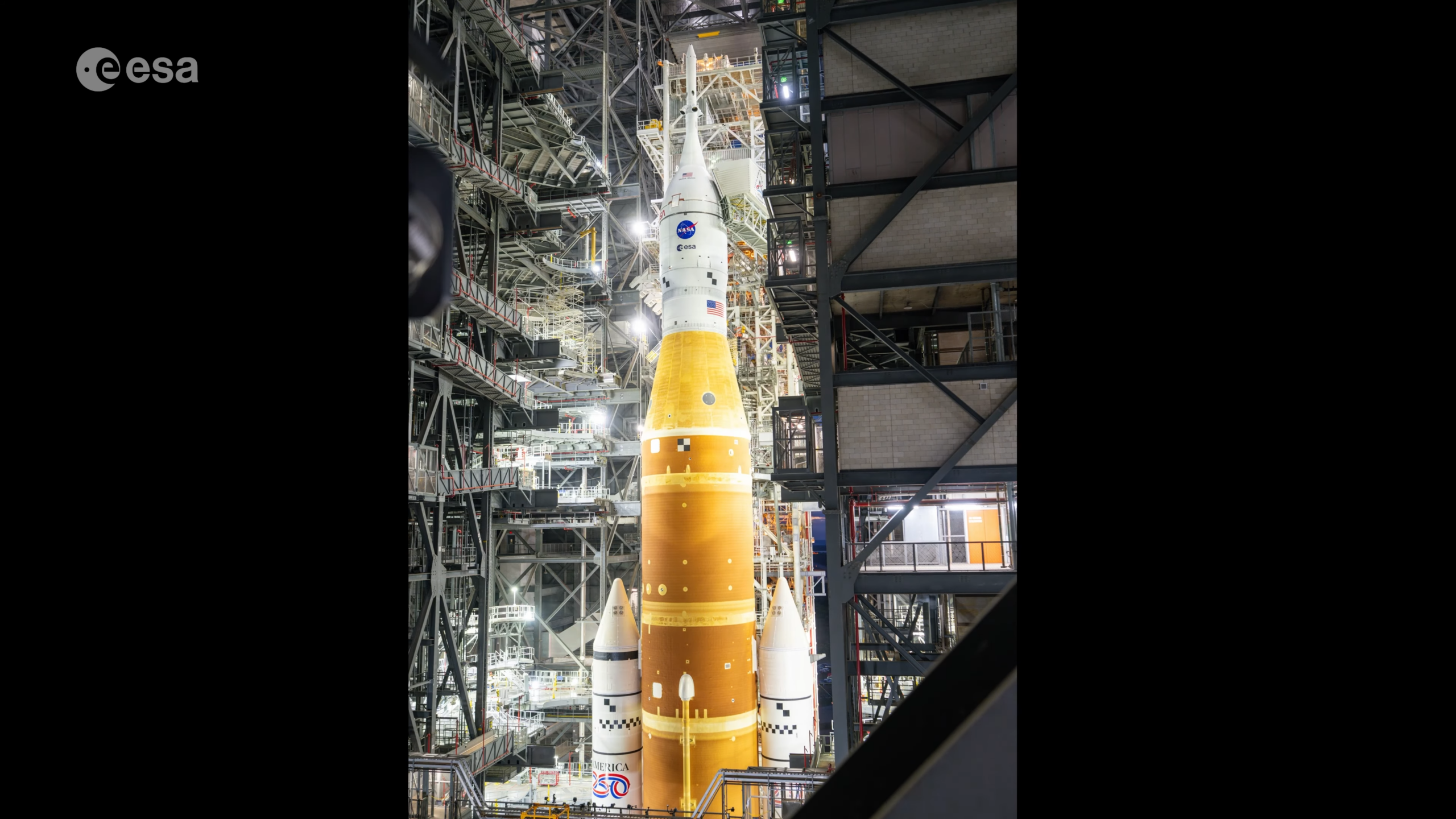 Antes de salir al exterior, las imágenes ofrecen una vista del interior del Edificio de Ensamblaje de Vehículos (VAB). Esta estructura masiva es como el telón de fondo y permite dimensionar el tamaño real del cohete SLS.