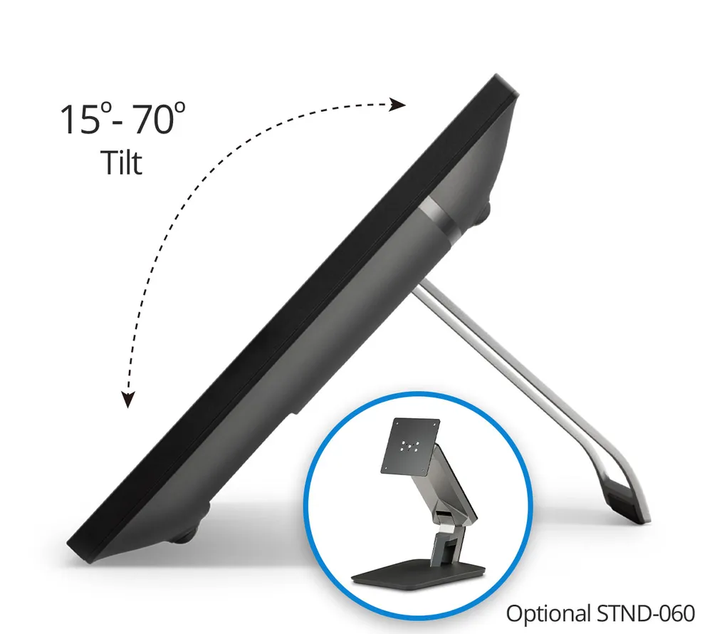 El monitor permite interactuar directamente con el contenido sin perder contacto visual con el público. Su pantalla táctil PCAP de 10 puntos se combina con un lápiz activo que ofrece 4096 niveles de sensibilidad a la presión y una inclinación de ±50 grados. Este lápiz se guarda y carga de manera inalámbrica en el soporte incluido.